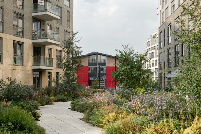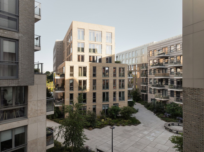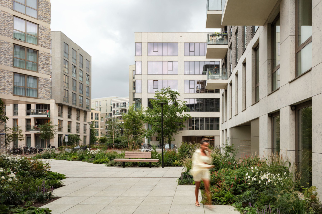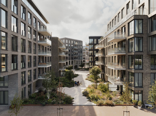 Архитекторы стремились создать разнообразную среду, поэтому на фасадах – разные виды кирпича и камня, а граница между мощением и зеленью размыта. Первые этажи заняты как собственно жильем, так и офисами или же коммерческими площадями.