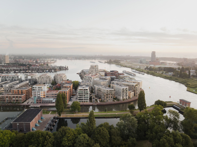 Плотная жилая застройка по проекту бюро KCAP на искусственном острове в амстердамском порту сочетает разновысотные корпуса и «органическую» схему озеленения.