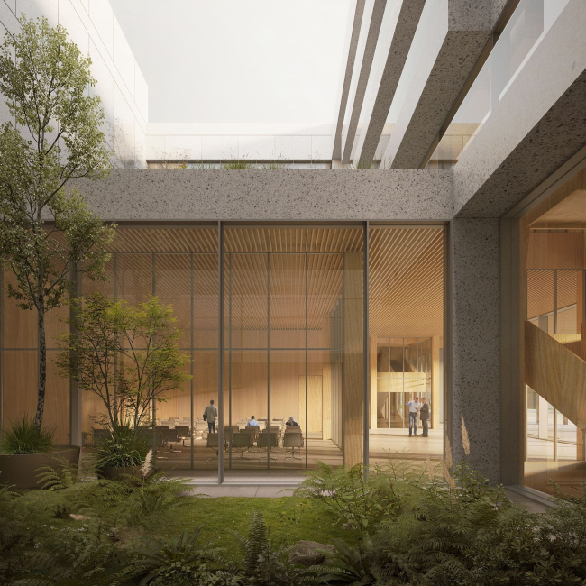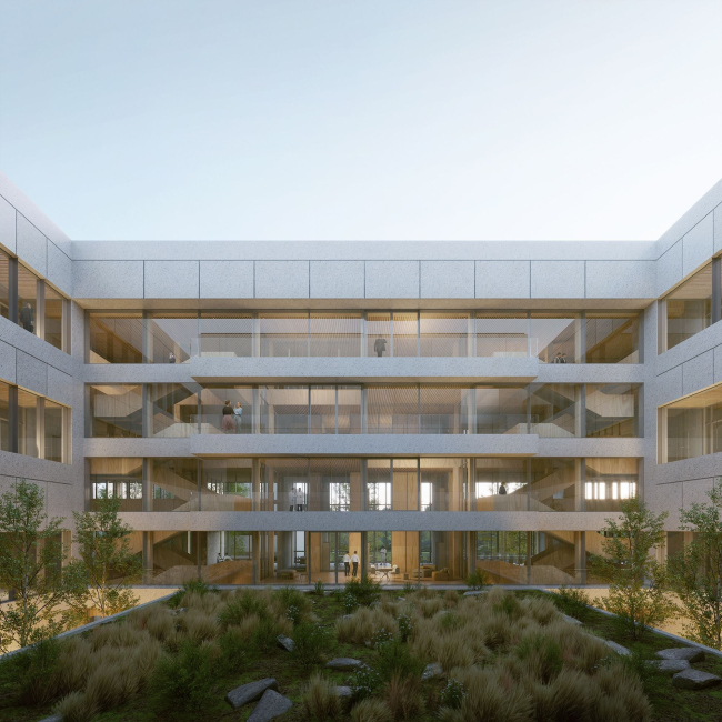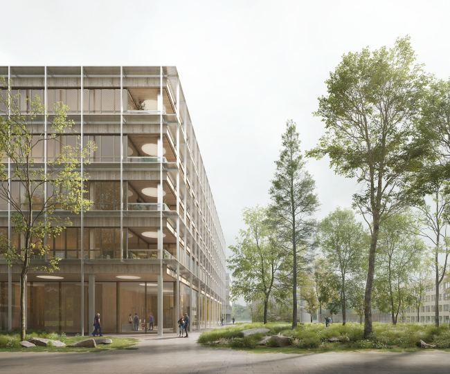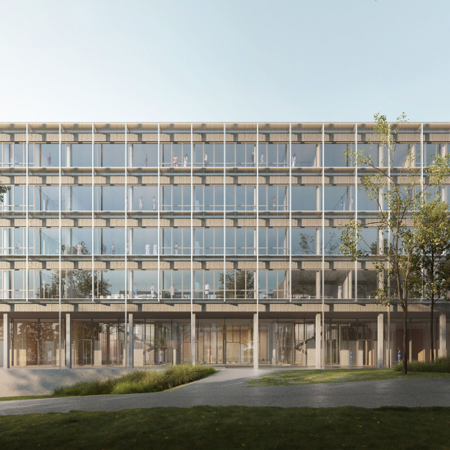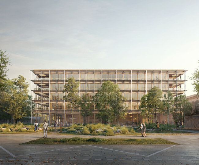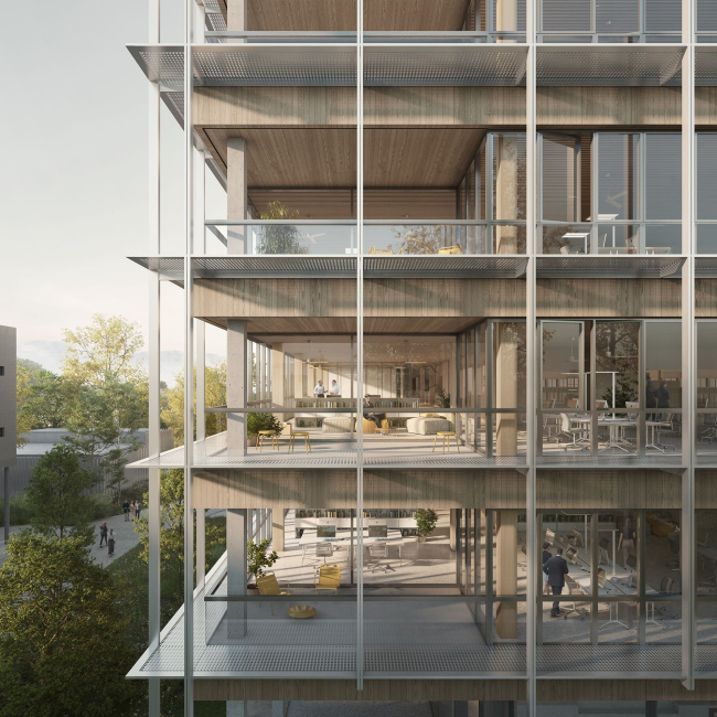 У остальной части здания, включая лаборатории, офисы и переговорные, будет гибридная конструкция из бетона и дерева. Большие окна обеспечат помещения естественным светом, при этом от солнечного жара их защитят автоматические внешние жалюзи. Виды на кампус, Альпы и Женевское озеро, обилие света и деревянных поверхностей, проницаемость сделают интерьер нового корпуса удобным местом для работы и общения исследователей.Корпус перспективных научных исследований Федерального политехнического университета ЛозанныВизуализация © Filippo Bolognese