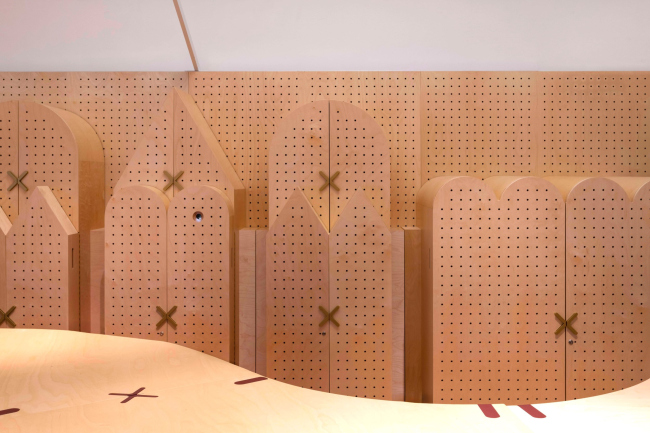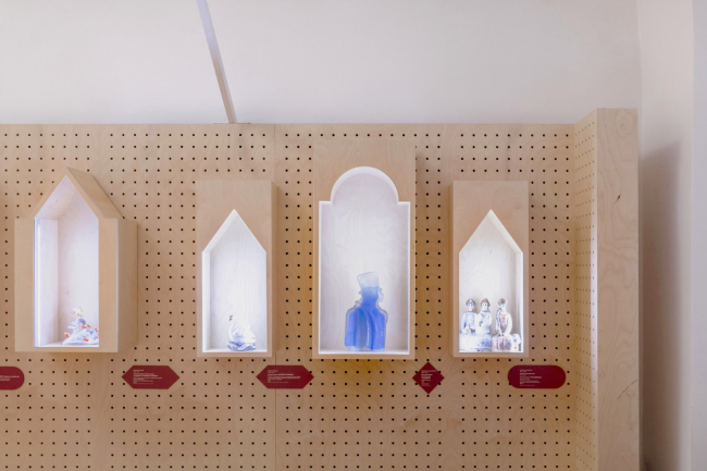 Поскольку все поверхности стен перфорированные, пространство легко адаптируется к любой музейной экспозиции. Экспонаты можно развешивать повсюду, включая створки шкафов. Кроме того, в разных уголках помещения – на дверцах и панелях – спрятаны небольшие декоративные «секретики», раскрывающие интересные детали выставок Хлебного дома.