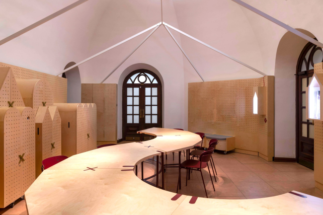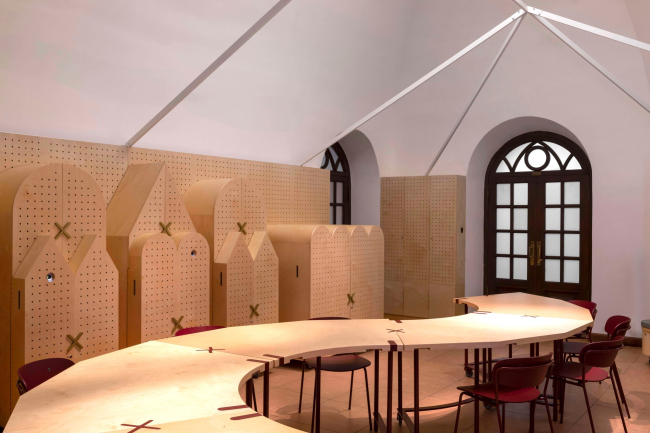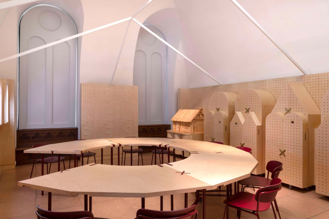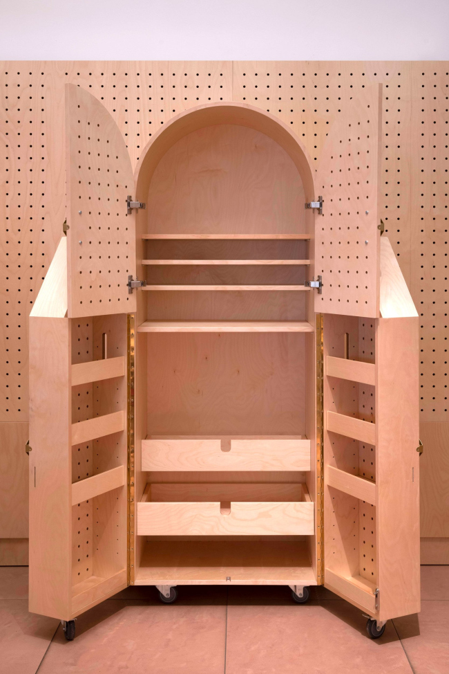 Система хранения спроектирована по принципу шкафа столяра: инструменты и материалы аккуратно размещены не только в ящиках, но и на внутренней стороне дверей. Скульптурные шкафы, расставленные вдоль стен, стали главной «фишкой» мастерской – их хочется рассматривать. Как и столы, они выполнены из светлой фанеры с перфорацией. Материал контрастирует с неоготическими сводами.