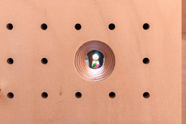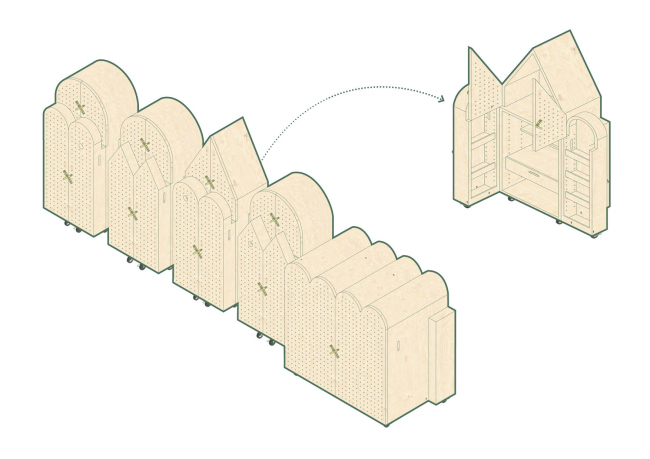 Вдохновением для шкафов послужили резные секретеры XIX века Wootton и столики для рукоделия того же периода. Все эти образы объединяет то, что каждая их поверхность предназначена для хранения. По замыслу автора, внутреннее наполнение шкафов должно удивлять зрителя: открывая дверцу, человек попадает в мир ремесел, и ему сразу хочется что-то создать. В одном шкафу собрано все необходимое для работы с керамикой, в другом – с металлом и ювелирными изделиями, а в самом большом хранятся ткацкие станки.
