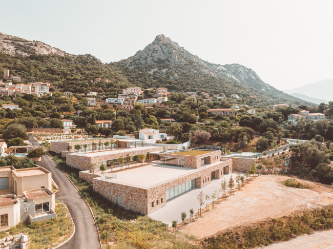 Âïèñàííûå â ðåëüåô íèçêèå îáúåìû îêîí÷àòåëüíî «èñ÷åçàþò» â ëàíäøàôòå áëàãîäàðÿ îáëèöîâêå ôàñàäîâ ìåñòíûì êàìíåì â òåõíèêå äèêîé êëàäêè. Òàâåëëà â ñâîèõ ïðîåêòàõ âñåãäà ñòðåìèòñÿ óñòóïèòü ïðèðîäå ïåðâåíñòâî (âñïîìíèì äðóãóþ åå øêîëó, â Ïðîâàíñå), è åå ðàáîòà â Ëóìèî ïðîäîëæàåò ýòó ëèíèþ, òåì áîëåå ÷òî çäåñü ðå÷ü èäåò î æèâîïèñíîé ãîðèñòîé ìåñòíîñòè, ñïóñêàþùåéñÿ ê Ñðåäèçåìíîìó ìîðþ.