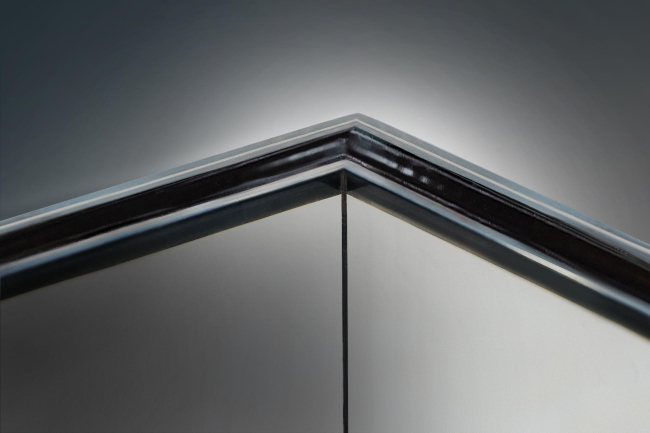 Сборка стеклопакета занимает четыре дня: на первом этапе делаются заготовки для обоих частей, затем стекла склеиваются под углом 90º, затем, по очереди, собираются обе герметичные камеры. Шов также надежно герметезируется при помощи бутила и силикона. В результате с внешней стороны стык оказывается совсем незаметен, а изнутри вид нарушает только вертикальная полоска толщиной всего 3 мм.