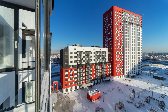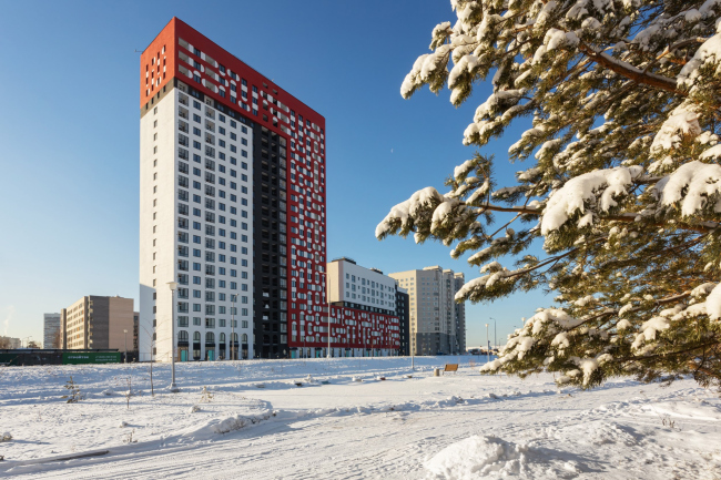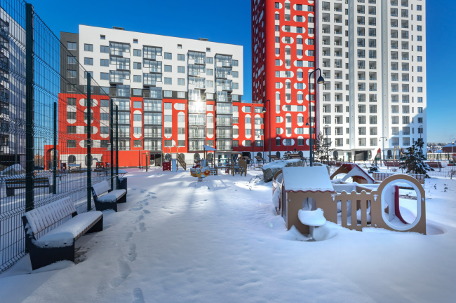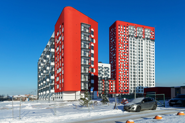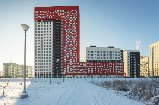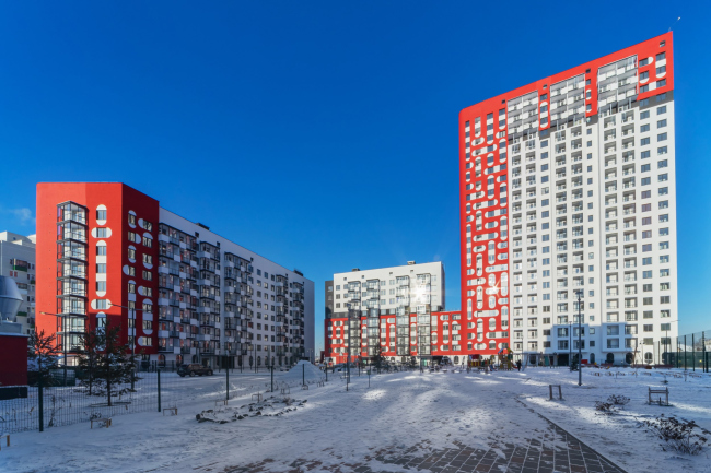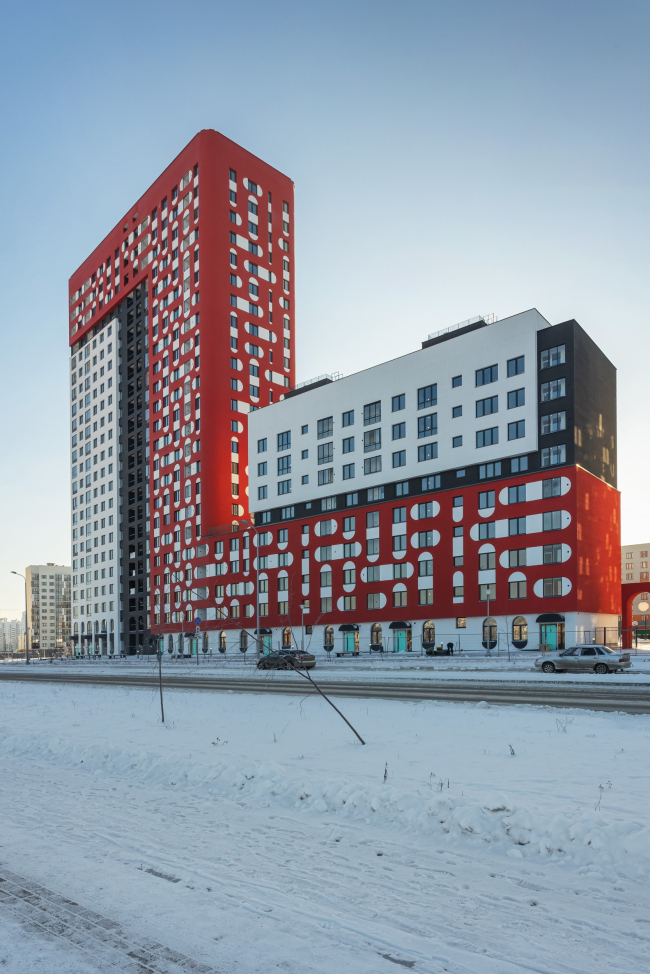 Суперграфика на фасадах жилого комплекса, построенного в Екатеринбурге по проекту бюро «План Б», вдохновлена мезенской росписью. Красный пигмент для 23-этажной башни выбрали не только как акцентный, но и устойчивый в штукатурке. Не менее яркими получились вестибюли подъездов, оформленные приемом color block.
