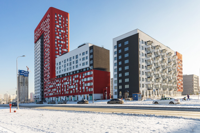 Описание предоставлено архитекторами Жилой комплекс состоит из двух зданий: одно формирует фронт улицы Тенистая, а другое – двор. Место изгиба улицы подчеркивает 23-этажная башня-доминанта, остальные секции – девятиэтажные.