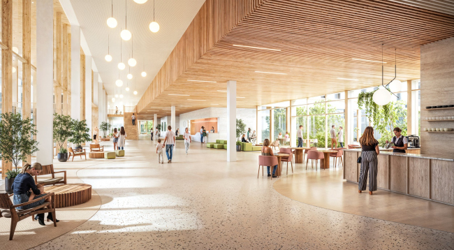 Обилие естественного света, натуральные материалы, связь с природой должны создать в больнице комфортную атмосферу для пациентов и сотрудников; для медицинского персонала предусмотрены удобные рекреационные пространства.Больница Ганноверского медицинского института© HENN / C.F. Møller Architects