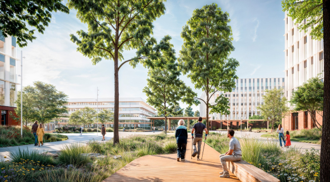 Корпуса расположатся на месте нынешнего пустыря, среди деревьев и лужаек, между существующими институтскими зданиями и лесом Айленриде, который отделяет институт от остального Ганновера. Природное окружение продолжают благоустроенные дворы и зеленые крыши, а главное – расположенная в центре Больничная площадь. Когда завершатся все очереди строительства, площадь будет окружена кольцом построек, а также «перголой» – навесом на стройных опорах. Здесь не будет парковок: с остальной частью вуза новостройку свяжет автобус-шатл.