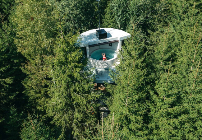 Описание предоставлено архитекторами Проект разрабатывался специально для локации: в гуще хвойного леса образовалась естественная поляна диаметром 8-9 метров, поэтому дом имеет форму цилиндра высотой 11 метров. На его крыше располагается бассейн со стеклянным дном. Согласно концепции, на территории бутик-отеля могут расположиться всего четыре такие виллы.