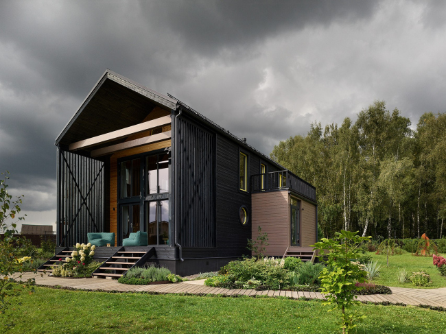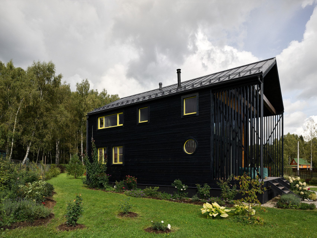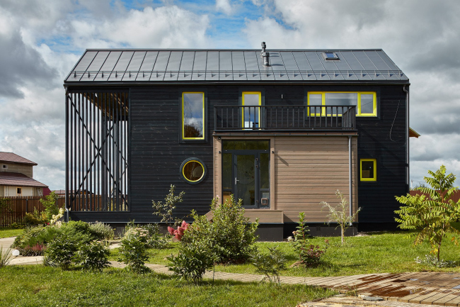 Дом каркасный и предназначен для круглогодичного проживания. Толщина утеплителя в стенах – 250 мм, на крыше – 500 мм. Сочный темный цвет фасадов в сочетании с лимонными рамами выделяет дом на фоне остальных.