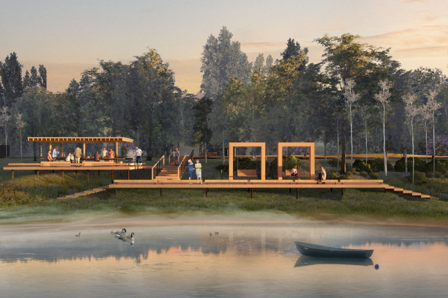 Описание предоставлено архитекторами Название концепции «Речная галерея» отсылает к архитектурному элементу и позволяет раскрыть основную идею проекта: галерея выступает в роли променада, а также связывает разные пространства друг с другом.