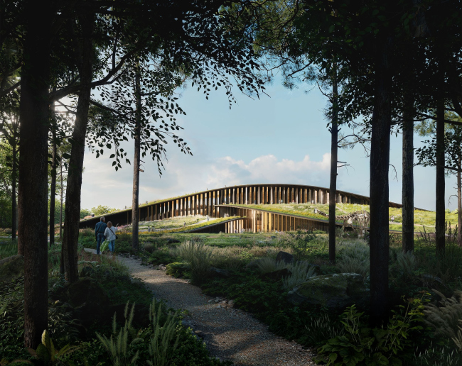 Композиция образована из трех перекрещенных «лент», конструкция будет деревянной, а фасады – из обожженного дерева. Кровли озеленят и снабдят прогулочными дорожками: они станут продолжением парка. Вокруг создадут общественные пространства, самое обширное – с юга, у главного входа. В центре расположится вестибюль, откуда можно будет попасть в расходящиеся лучами крылья: пять для постоянной экспозиции и одно для временных выставок и мероприятий. На верхнем уровне устроят библиотеку и кафе, в цоколе – образовательный центр.Венгерский музей естественной истории© BIG