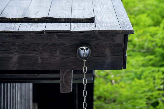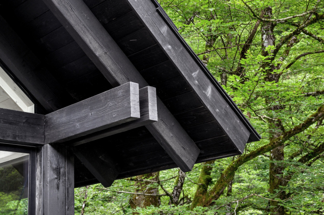 Сохранили имеющийся кирпичный цоколь и часть деревянных конструкций старого домика. А вот стены заполнили панелями из обожженной местной ели, собранными на буковых штифтах, такой же дранкой покрыли крышу, рамы тройного остекления также сделали из ели. Отдельно подчеркивается, что использование клея и каких-либо химикатов было полностью исключено: обожженная древесина согласно древней технологии обработана лишь сосновой смолой, которая надежно защищает постройку от влаги, грибка и насекомых, не нанося при этом никакого вреда природе.