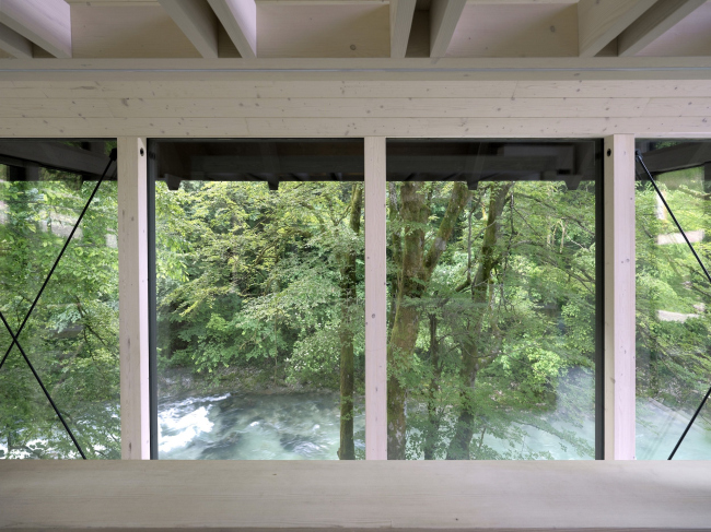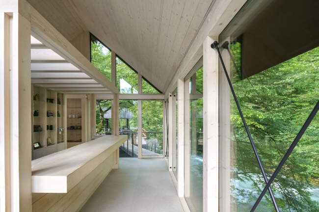 Необычным решением стало разделение архетипического двускатного павильона на две половины: абсолютно прозрачную, сразу открывающую туристам впечатляющие виды на ущелье, и сплошную, полностью закрытую черными досками. Внутренняя же отделка по контрасту выполнена из светлой лиственницы, обработанной прозрачным натуральным маслом. Конструктивное устройство интерьера с видимыми вертикальными опорами и условными «полочками», по замыслу архитекторов, отсылает к традиционным для всего альпийского региона сенникам.Посетительский центр в ущелье ВинтгарФотография © Janez Martincic / предоставлена Ofis Arhitekti
