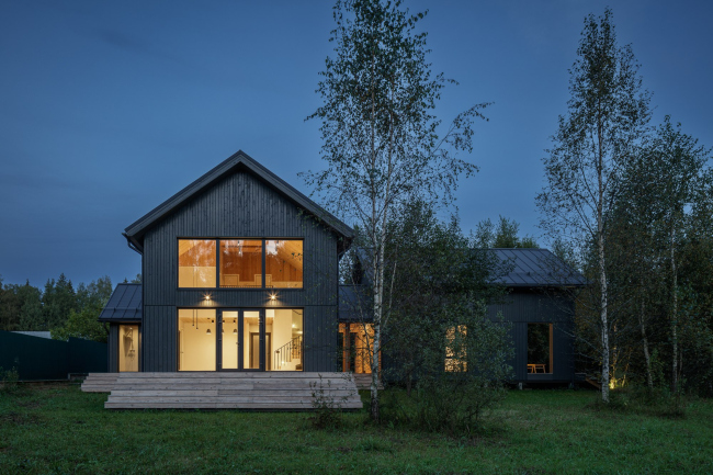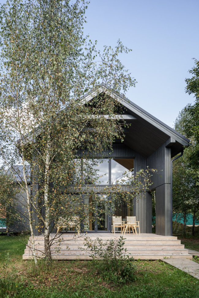 В первом модуле расположены кухня-гостиная и спальня на антресоли – он предназначен для отдыха пары или семьи. Второй модуль более просторный: в нем две полноценные спальни и большая двусветная гостиная, рассчитанная на размещение шести гостей. Благодаря панорамному остеклению удалось визуально объединить интерьер с окружающим пейзажем и наполнить пространство естественным светом.