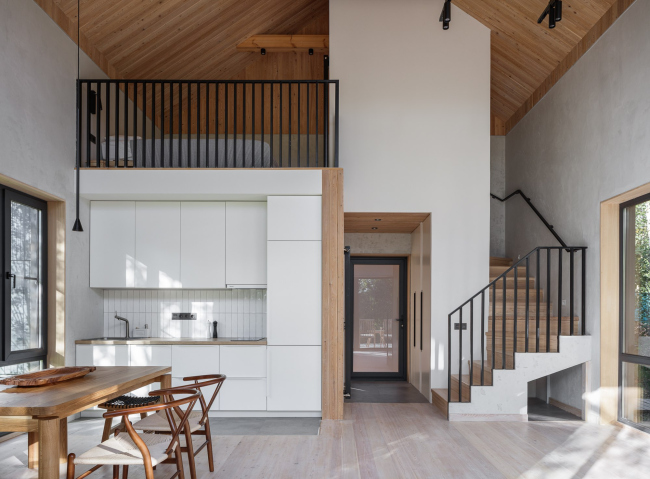 Интерьер дома получился легким и светлым, при этом все поверхности тактильно приятны: стены покрыты бархатистой белой штукатуркой, в отделке использовано много дерева и черного матового металла.
