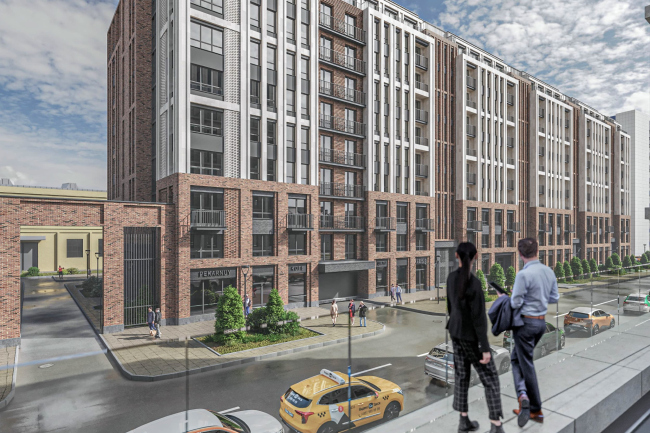 Олег Александров рассказал об основных изменениях. Прежде всего, команде проекта удалось привести к большему порядку фасад, выходящий на улицу Фокина: сетку окон укрупнили, блоки лестничных пролетов понизили, последний десятый этаж выделили цветом, близким к пасмурному петербургскому небу – чтобы растворялся и уменьшал массу здания. Таким образом сложилась почти регулярная последовательность светлых ризалитов и кирпичных ниш. Торец, обращенный к бизнес-центру «Нобель», сделали полностью глухим. На фасадах появилось больше кирпича, кирпичная же арка соединяет дом с производственным цехом завода «Людвиг Нобель» – объектом культурного наследия, который сейчас реконструируют под ледовую арену.