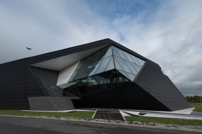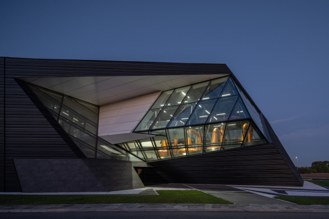 Кристалл. Объем, который, как будто бы, трансформируется на глазах – продолжение диалога «мужского и женского» объемов Музея коньяка, большая часть которого спрятана, как и здесь, под землей.
