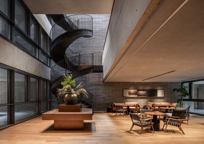 Главную роль в проекте играет бетон, однако им архитекторы не ограничились: мощение выполнено из натурального камня, фасады покрыты кирпичом, коридоры с номерами закрыты экранами из медной сетки. Живописные атмосферные эффекты отражает и усиливает декоративная 24-метровая башня из стеклоблоков. Отдельное приключение для гостей – «Соляная пещера», облицованная плиткой из розовой гималайской соли.Отель «Сижан»Фото © DONG / Vector Architects