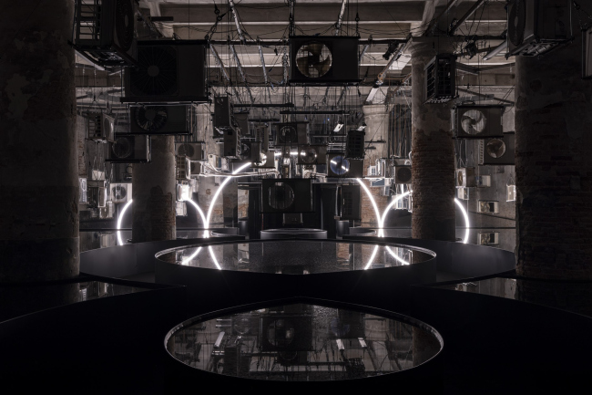 Темная душная комната в Кордери Арсенала. Над черными бассейнами, словно гигантские соты, висят десятки кондиционеров. Инсталляция «Перспектива третьего рая» Микеланджело Пистолетто и Паоло Нальдини – тревожная метафора современности. Кондиционеры, эти символы комфорта, здесь превращаются в аллегорию тупика: они спасают от жары, но усугубляют ее, пожирая энергию и нагревая атмосферу. Только в 2022 году от жары в Европе погибло 70 тысяч человек, и это лишь начало – предупреждают авторы.