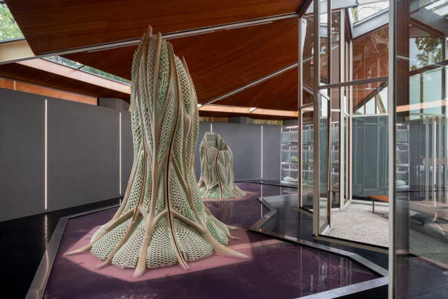 В сердце следующего раздела, посвященного воде, инсталляция Necto (авторы SO–IL, Мариана Попеску и TheGreenEyl) – материализованная поэзия текучести. Этот прототип воплощает принципиально новый подход: здание как временный организм, способное «раствориться» без следа. Созданная из биоразлагаемых волокон с помощью алгоритмического проектирования, конструкция напоминает гигантскую паутину, которую можно буквально распустить на нити по завершении жизненного цикла. Necto – проект манифест: временный, а не стационарный, безотходный и гибридный, соединяющий ручное ремесло и high-tech.