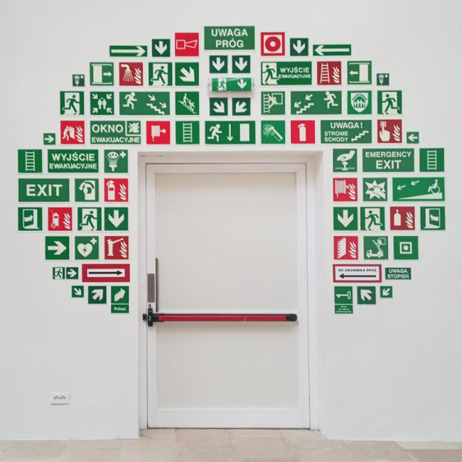 «Лары и Пенаты: о создании чувства безопасности в архитектуре». Уморительно смешная экспозиция о суевериях и оберегах в современной архитектуре. Древнеримские Лары и Пенаты – духи-хранители дома и покровители уюта – в XXI веке перевоплотились в неожиданные формы. Это, например, датчики противопожарной безопасности, дверные глазки, огнетушители (обычно их помещают в ящики наподобие табернаклей), стикеры EXIT (в соответствии с международными стандартами – обязательно зеленого цвета с белыми пиктограммами и белыми рамками). Не оценивая эффективность этих знаков, выставка подчеркивает их важную роль в создании чувства безопасности. Авторы – архитектор Мацей Сюду, художники Кшиштоф Маниак и Катажина Пшезваньска.