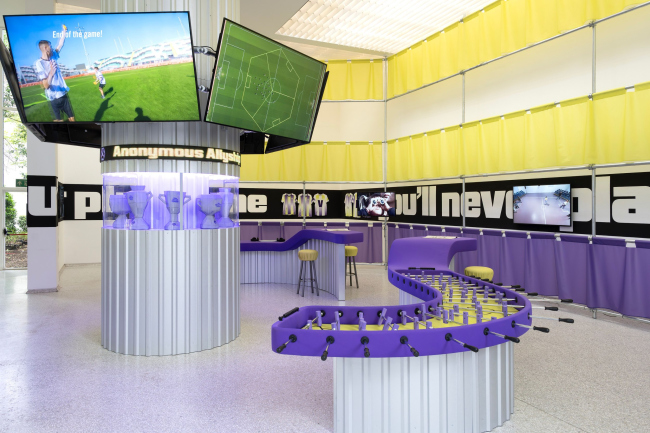 Куратор Аманда Пинатих и социальный дизайнер Габриэль Фонтана представляют проект «Вне игры: пространство для переосмысления общности» (SIDELINED: A Space to Rethink Togetherness). Это спортивный бар, где снижают градус агрессии футбольных и прочих фанатов. Например, за счет круглой барной стойки, создающей пространство для разговора на равных. Плюс предлагается практиковать такие виды командных игр, где команд не две, а три. И наряжать игроков в нейтральные костюмы. Это называется «внедрение квир-теории и методологии в трансформацию культового пространства спорт-бара».