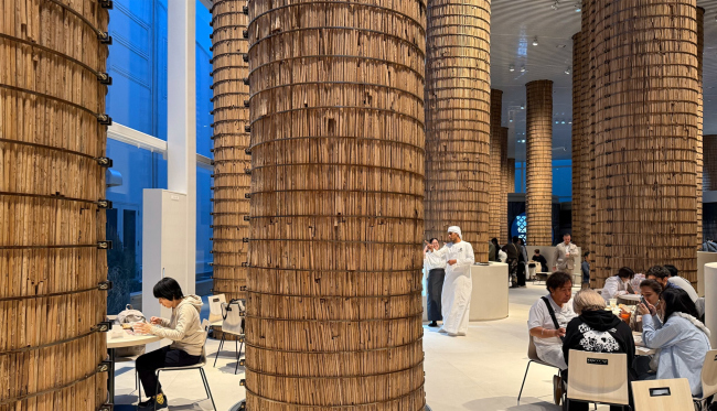 Концептуально форма отсылает к караван-сараям, которые располагались вдоль Шелкового пути и служили приютом для купцов. Внутри – неожиданный инженерный спецэффект. Пока зрители рассматривают инсталляции о знаковых проектах страны, движущаяся платформа медленно поднимает их на верхний уровень здания. Двери распахиваются и вы оказываетесь на залитой солнцем крыше среди деревянных колонн, символизирующих сад.