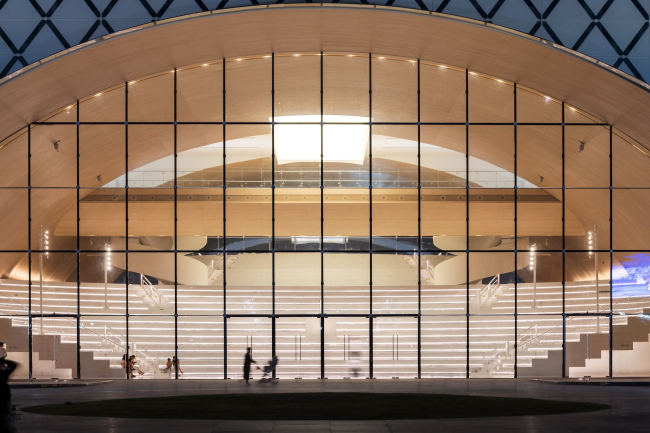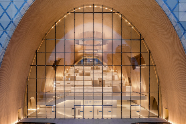 Главным таким образом стал «городской» фасад, обращенный к просторной площади. Его ритм задают три разной кривизны арки, каждая из которых отмечает одну из «городских гостиных». Четвертая полуарка образует консоль, защищающую заглубленную площадь с амфитеатром со стороны реки. За самой узкой и высокой аркой хорошо виден Зал знаний с уступами стеклянных книжных стеллажей. В его оформлении архитекторы ориентировались на решение библиотеки «Ооди» в Хельсинки. Средняя скрывает универсальный зал с большой сценой, приспособленный для любых представлений. За самой низкой и пологой аркой просматривается выставочный зал, пространство которого, как сыр Маасдам, прорезано большими световыми фонарями. Во внутренней отделке всех зон в основном использован экологичный и недорогой бамбук.