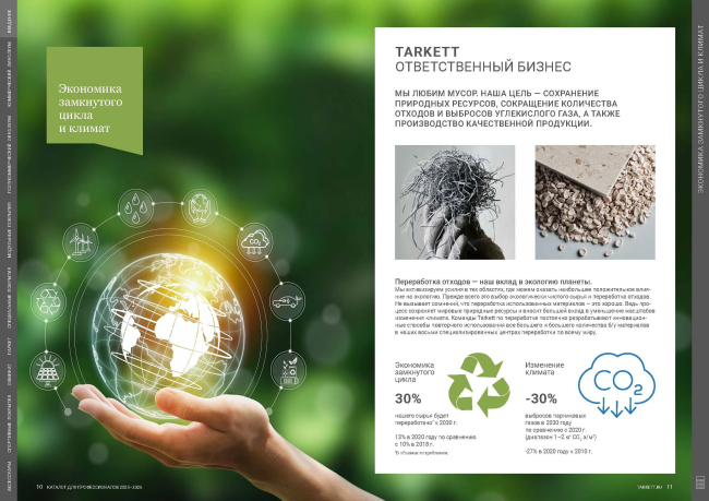 Tarkett продолжает демонстрировать приверженность принципам устойчивого развития. Вся представленная в каталоге продукция соответствует требованиям экологических стандартов «Листок жизни», Green Book и EcoMaterial. К 2030 году компания планирует увеличить долю переработанного сырья в производстве до 30% и сократить выбросы CO₂ на аналогичную величину. Все напольные покрытия безопасны для здоровья человека и получили рекомендации к применению в детских, медицинских и образовательных учреждениях.