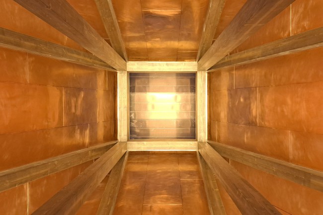 Навес над тандыром построен на участке с частным жилым домом VILLA Е, в непосредственной близости с павильоном летней кухни. Квадратный в плане 4,5×4,5 м и высотой 9 м, навес визуально разделен по вертикали на две части: периметральную деревянную колоннаду из бревна с экранами из нержавеющей стали высотой 3 метра и венчающую ее четырехскатную кровлю 6-метровой высоты из дерево-клееного бруса, снаружи покрытую зеленой патинированной медью, а изнутри – красной.
