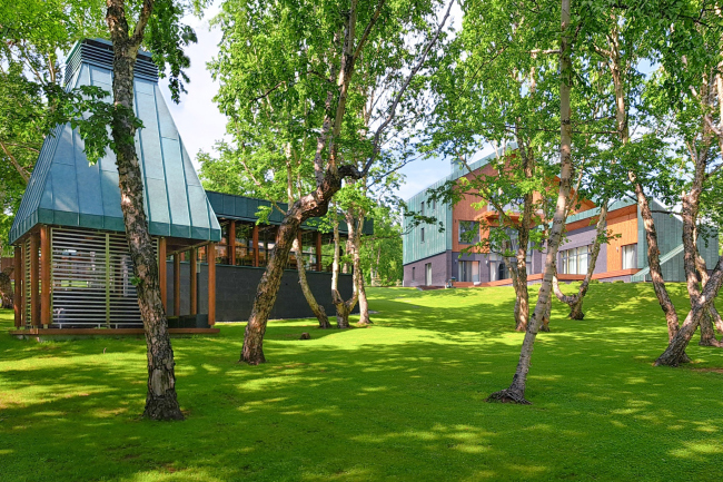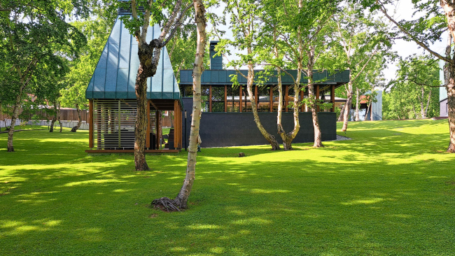 Загородный жилой дом на Камчатке. Схема генерального плана© Архитекторы Гикало КупцовЖилые дома ориентированы относительно основной проектной оси север-юг, объемы остальных строений повернуты на 21 градус параллельно границам участков. Дома размещены ближе к центру каждого из участков, что обусловлено стремлением обеспечить максимально приватное, обособленное существование, сохранив по возможности имеющиеся деревья – преимущественно камчатские березы. При этом они расположены таким образом, чтобы не закрывать лучшие виды на окружающую природу, обеспечивая оптимальный для всех помещений режим инсоляции.