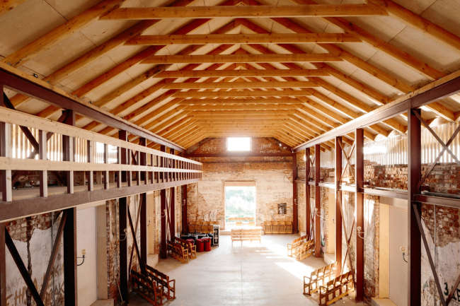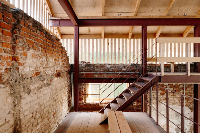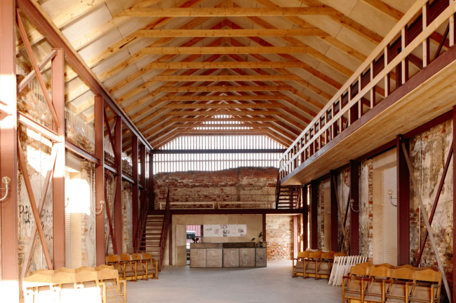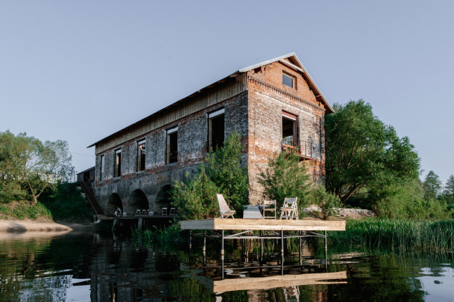 Бюро amor в соавторстве с датчанами из Mette Lange Architects приспособило бывшую гидроэлектростанцию под Суздалем для летней площадки проекта МИРА центр, сохранив элегическое настроение руины. Новую кровлю, которая защищает уцелевшие кирпичные стены, держит независимая металлическая конструкция, а в отделке используются простые материалы – сосна и фанера. Конструктивные решения выполнены при участии мастерской деревянной архитектуры Евгения Макаренко.