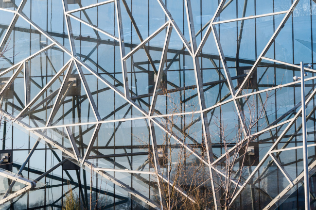Главную роль в материализации образа цветка играют «ледяные осколки», которые образуют второй слой фасада. Они решены как треугольники разного размера, с рамой из алюминия, заполненной уникальными стеклоизделиями из триплекса. С лицевой стороны остекление завершается прижимными планками – более тонкими конструкциями, образующими «морозный» узор. Летом он напоминает прожилки на листьях или стрекозином крыле. Тем не менее, размеры треугольников внушительные – максимальная длина самого большого – 80 метров. Но с противоположного берега озера они выглядят хрупкими и тонкими, как настоящая корочка льда.