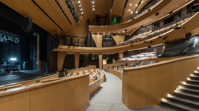 Большой зал с двумя балконами и тремя уровнями фойе рассчитан на 771 место и выглядит очень торжественно, хотя решен он довольно минималистично. Арочные своды, плавные полукруглые формы, приглушенные цвета напоминают архитектуру мечетей. Большая сцена отделана светлым дубом, на дверные полотна нанесен деликатный орнамент.
