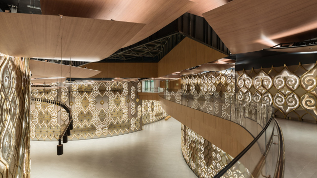 Для фойе и каждого из залов Наиля Кумысникова разработала собственные орнаменты и композиции. Фойе заполнили «золотые» и «серебряные» элементы из нержавеющей стали, напоминающие традиционные женские украшения. Архитекторы придумали для них многослойные стены-панно, в которые встроено освещение с диммерами, меняющими интенсивность, температуру и оттенок освещения. Вечером и в пасмурную погоду теплое свечение так и манит зайти внутрь. «Паруса» на потолке выглядят как деревянные, но на самом деле они тоже металлические – в соответствии с требованиями пожарной безопасности.
