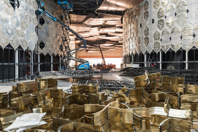 Оказалось, что красный цвет с конкурсных визуализаций татарской культуре не близок. Архитекторы Wowhaus пригласили для разработки декора Народного художника Республики Татарстан Наилю Кумысникову, она вместе с дизайнером Джамилем Федотовым предложила использовать золотые и серебряные поверхности так, чтобы превратить фойе в сокровищницу последней царицы Казанского ханства Сююмбике. Есть легенда, что ее казна была спрятана на дне озера Кабан, многие пытались искать. Когда на площадку принесли готовые элементы, они и правда напоминали груды монет.