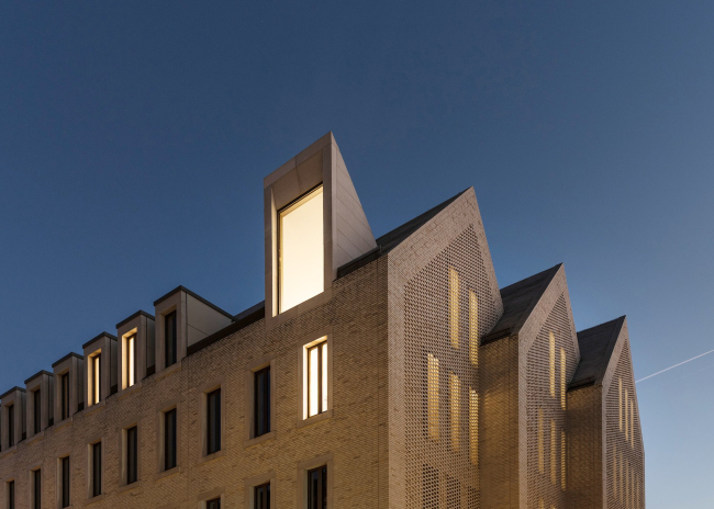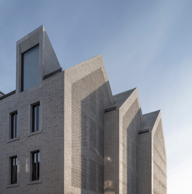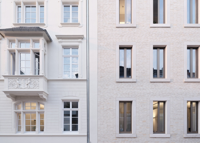 В формах нового здания архитекторы попробовали не только сделать прямую отсылку к самой ратуше, но использовать универсальный для центров небольших центрально- и западноевропейских городов образ, эксплуатирующий хорошо узнаваемые формы, пропорции, материалы и приемы, но однозначно воспринимаемый как современный и уникальный. Три двускатных объема соединены и вытянуты вдоль улицы так, что их щипцы выходят на еще одну боковую улочку и дальше к площади Янсхоф. И фасады, и даже скаты крыш выложены клинкерным кирпичом, швы между которым особым образом затерты методом шламования. В данном случае архитекторы подобрали светлый песочный оттенок, идеально сочетающийся с цветом ратуши, гармонично вписывающийся в окружение и создающий необходимый эффект триединого монолита.