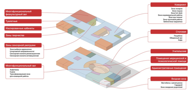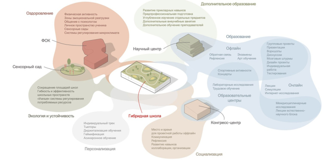 Один из принципов нашей концепции подразумевает оптимизацию планировочного решения гибридной школы. В классической школе значительные площади занимают спортивный блок, столовая, актовый зал, библиотека. Обычно такая структура предполагает большое количество учебных кабинетов, многие из которых остаются незадействованными в течение определенного времени. При переходе к гибридному образованию не нужно такое количество классных помещений, а площади можно оптимизировать. Большая часть учебных пространств может быть реализована как коворкинг. Сохраняется сокращенное театральное пространство, которое может использоваться и для проектной работы, а также спортивные зоны как место для выброса адреналина, и блоки вспомогательных помещений. Лаборатории, спортивный блок, большой зрительный зал и мастерские преобразуются в отдельные образовательные центры, которые используются несколькими школами. Это снижает затраты на капитальное строительство и оснащение школы, а сами центры функционируют более эффективно.