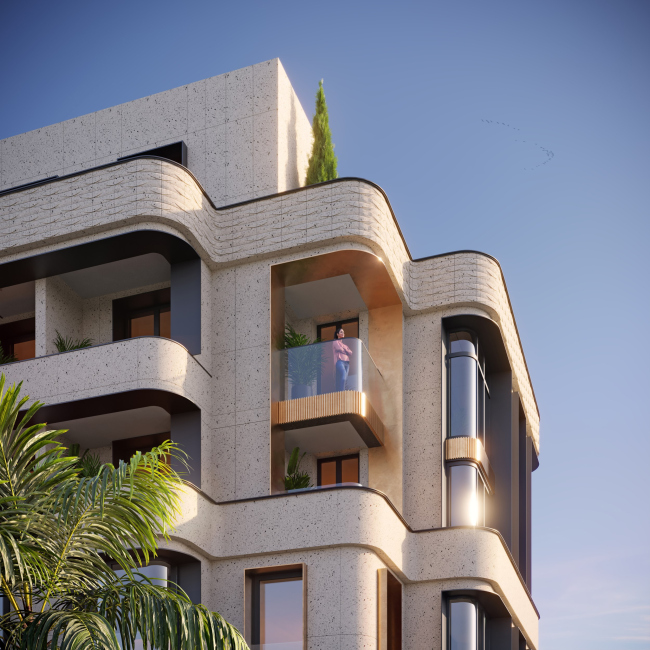 В отделке используются премиальные материалы. Светлые плиты из стеклофибробетона и натурального камня придают зданию монолитность и устойчивость, а вместе с тем – чистый облик. Акценты цвета меди добавляют фасаду глубину и индивидуальность.