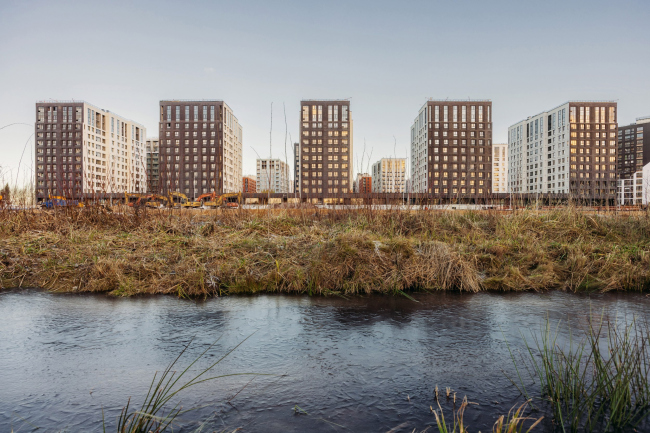 Тем не менее, окраина. Так что и строительство здесь ведется прагматичное, плотное, крупное. Чем-то сравнимое с подмосковным Пушкино, где Сергей Никешкин и KPLN построили не один комплекс. Проектировать для таких мест, на самом деле, – задача, которая требует и умения, и терпения; однако в тех случаях, когда к задаче прикладывает руку архитектор, а не только планировщик и проектировщик, это как правило ощущается. То в детали, то в нюансе, а то и в лаконичности решения самой по себе.