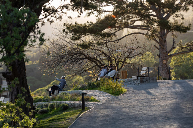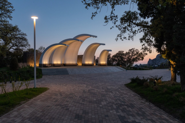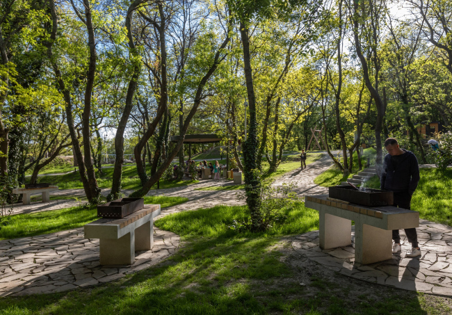 Проект основан на гармоничном сочетании природного и исторического контекста. В качестве материалов использовался местный камень и дерево. Сыпучие покрытия дорожек не нарушают корневую систему деревьев. Малые формы – беседки, скамейки и другие элементы выполнены в крымском стиле, что подчеркивает идентичность места. Для освещения используются экологичные светильники с теплым светом, которые не влияют на биоритмы животных и растений. Новые функциональные зоны вписаны в ландшафт с минимальным вмешательством.