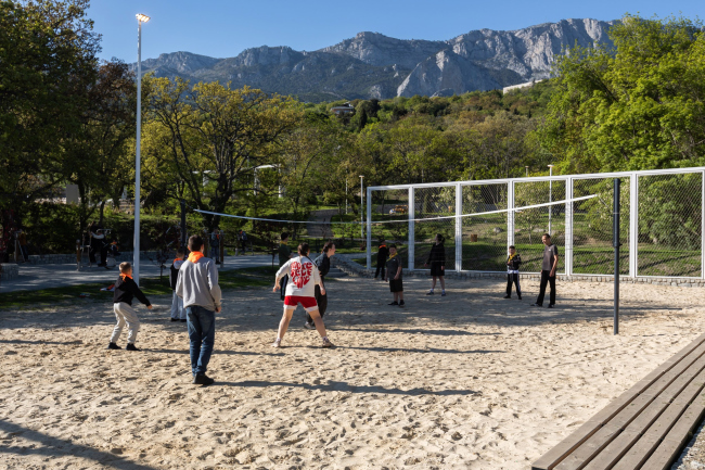 Центральная сцена и амфитеатр – главная площадка для мероприятий, вокруг которой сформировано пространство для зрителей. Спортивные и игровые зоны включают воркаут, площадки для стритбола и волейбола, памп-трек для велосипедистов и скейтеров. Детские площадки – зоны для семей с детьми, расположенные рядом с пикниковыми участками. Со смотровых площадок открываются виды на Алупку и побережье.