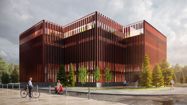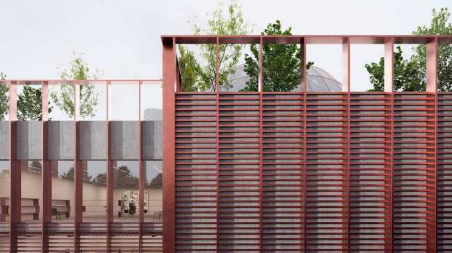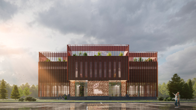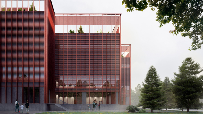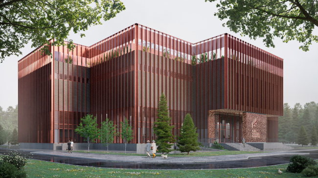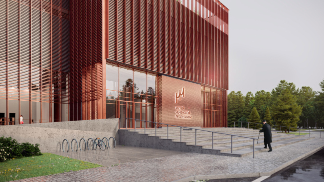 Неизменным остается объем, пятно застройки и высотные отметки «старого» музея. Однако проект предлагает оптимизацию почти всей планировочной структуры, что значительно упростит взаимодействие между пространством музея, посетителями и городом. Новый фасад из фибробетонных панелей в сочетании с медными оболочками вертикальных и горизонтальных ламелей возвращает зданию утраченную уникальность и объем в масштабе Новой площади культуры.