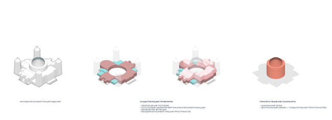 Функциональный характер здания существенно меняется. Прежде всего, в нем появится выраженная общественная досуговая часть – первый уровень здания, где разместятся библиотека и многофункциональный зал, кафе и книжная лавка. Второй уровень – обособленная часть музея, анфилада выставочных залов, где расположится постоянная экспозиция и залы временных проектов. Блок административных помещений собран в единый объем и размещен в независимой части здания. Фондохранилища и зоны сервиса расположатся на отдельном цокольном уровне.