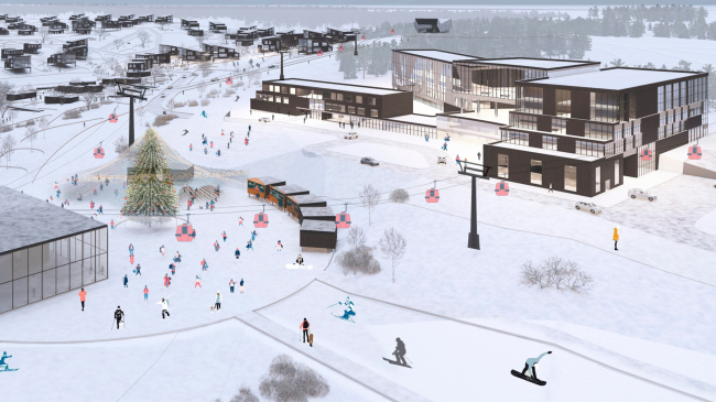 Комплекс включает в себя гостиничный корпус, жилые коттеджи, кинотеатр с открытым амфитеатром, прокат инвентаря, ресторан на вершине, оленью ферму и хаски-парк. Гостиничный корпус состоит из центрального вестибюля с амфитеатром и трех жилых блоков: