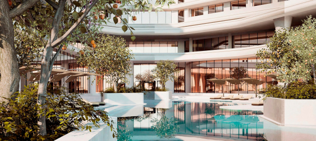 Полина Колодий Руководитель: старший преподаватель Наталия Ефимова Территория проектируемого объекта расположена в 30 км от Ялты – одного из самых популярных курортных центров полуострова. Гостиничный комплекс занимает примерно половину от всей площади земельного участка и включает три блока. Блок высотой в 11 этажей включает апартаменты и номера различных категорий. Блок 2 предназначен для размещения апартаментов и люксов. Блок 3 предназначается для размещения боулинга, VR-клуба, караоке, бизнес-центра и конференц-залов. Комплекс включает развитую рекреационную инфраструктуру: круглогодичные бассейны, бар на воде, 16 вилл, детский клуб и открытые прогулочные зоны. Все функциональные зоны связаны единой системой пешеходных маршрутов и ландшафтных пространств, сохраняя при этом возможность автономного функционирования каждого блока.