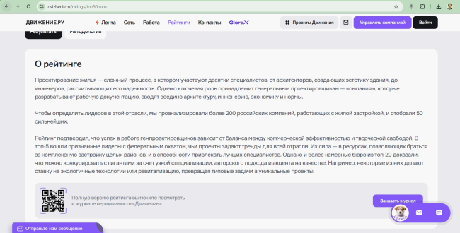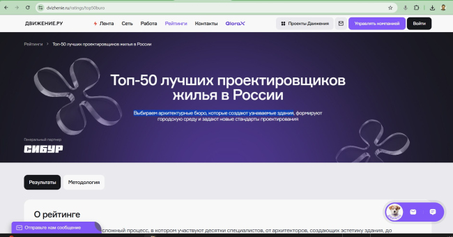 , составленный аналитическим центром «Движение.ру», опубликован в июне 2025 года и позиционирован как первый в России рейтинг компаний – генеральных проектировщиков многоквартирного жилья в России.