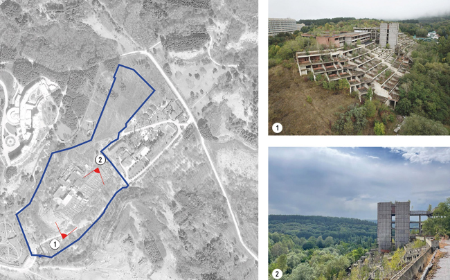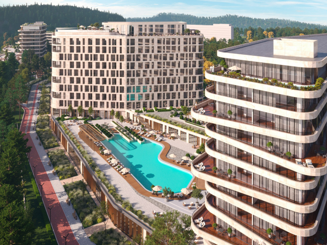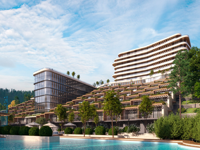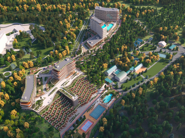 Описание предоставлено архитекторами Сейчас участок занимает здание санатория «Каскад»: оно простояло недостроенным много лет и находится в аварийном состоянии, поэтому было принято решение о его демонтаже. Архитекторы постарались сохранить и переосмыслить главную идею – каскадность, которая когда-то и дала название этому месту.