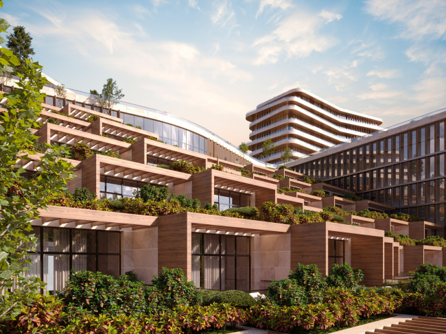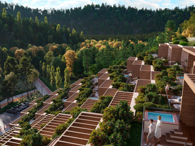 Команда проекта сделала акцент на уединении и тишине с помощью зеленых «карманов», и приватных террас. Гостиничный и санаторный корпуса объединены стилобатом с общественными функциями – рестораном, spa, лаунж-зонами. Большие витражи, открытые пространства и продуманная навигация создают ощущение легкости и природной открытости.